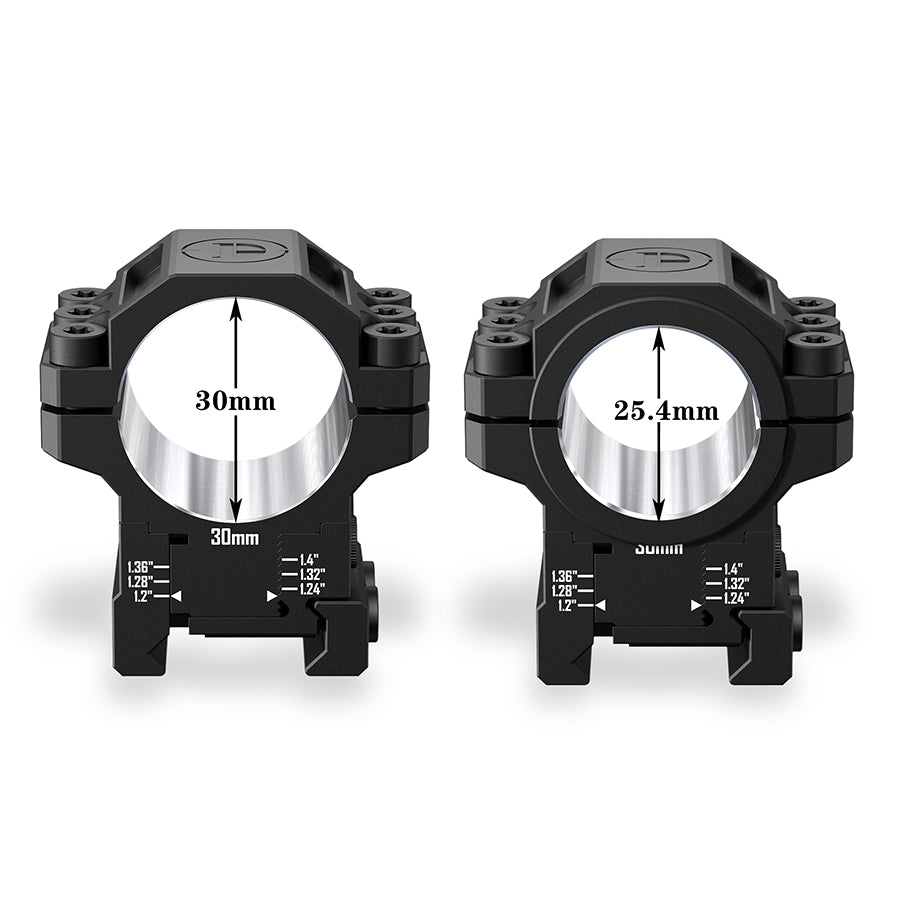 - Tamaños de tubo dual y personalización de altura de 6 niveles. Compatible con tubos de alcance de 25.4/30 MM, estos anillos ofrecen 6 alturas ajustables (1.2 1.24 1.28 1.32 1.36 1.4 para optimizar el alivio ocular y adaptarse a cualquier configuración.